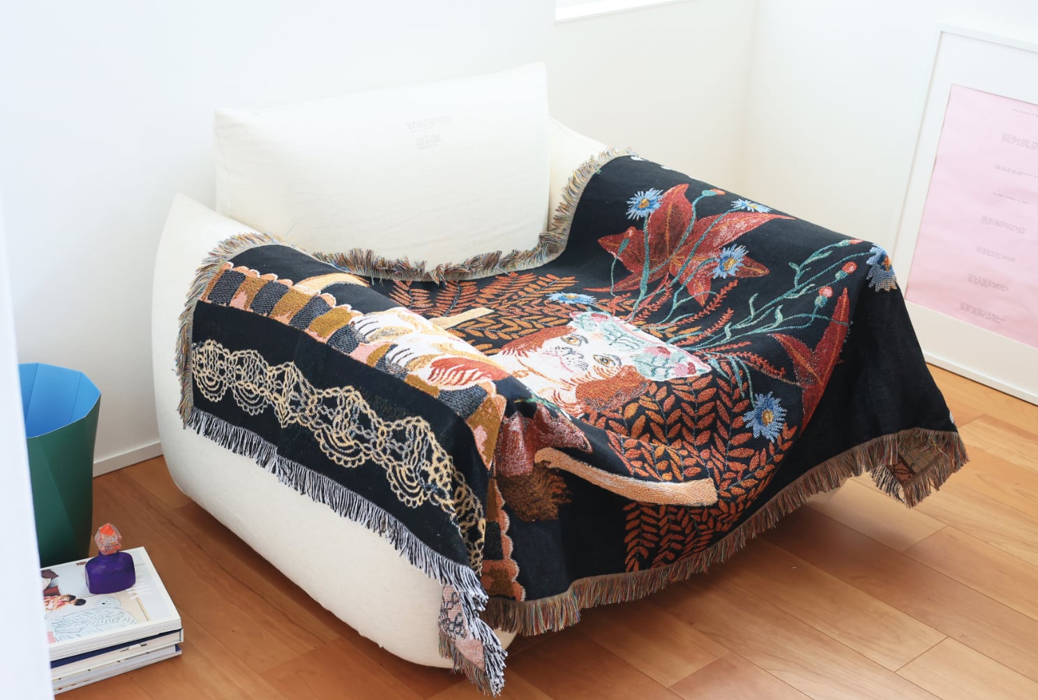 ソファにかけたり、壁に飾ったり、アーティスト作品ならではの雰囲気で、インテリアのポイントとなるアイテムです。