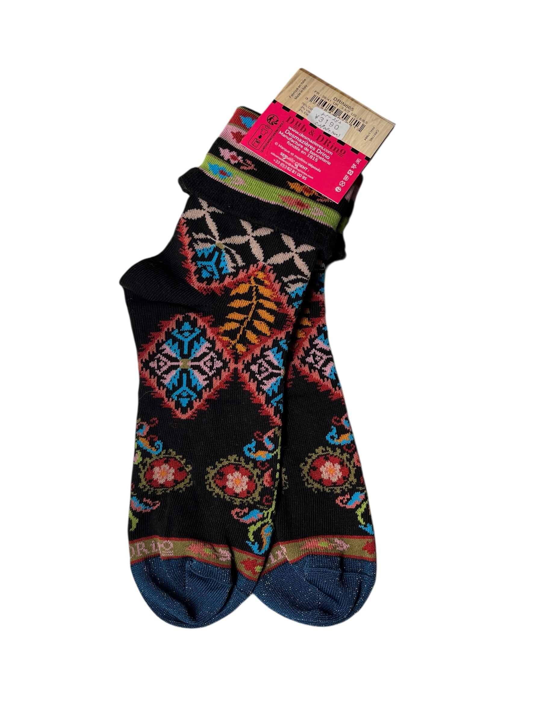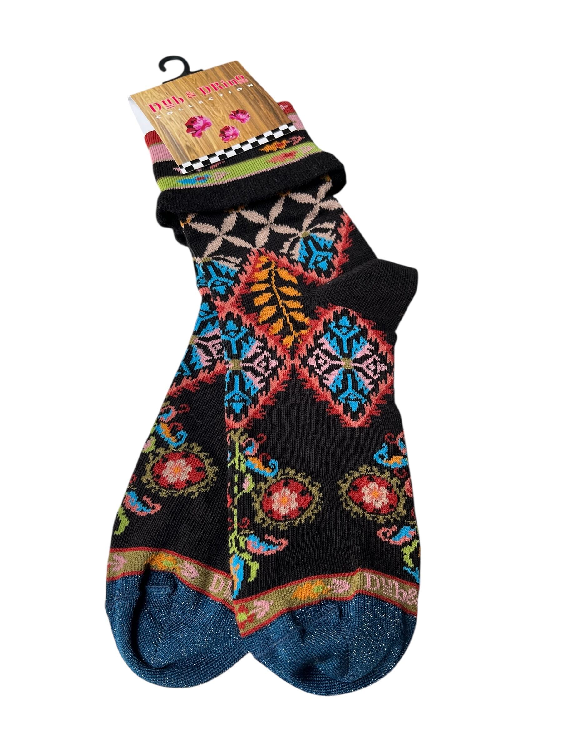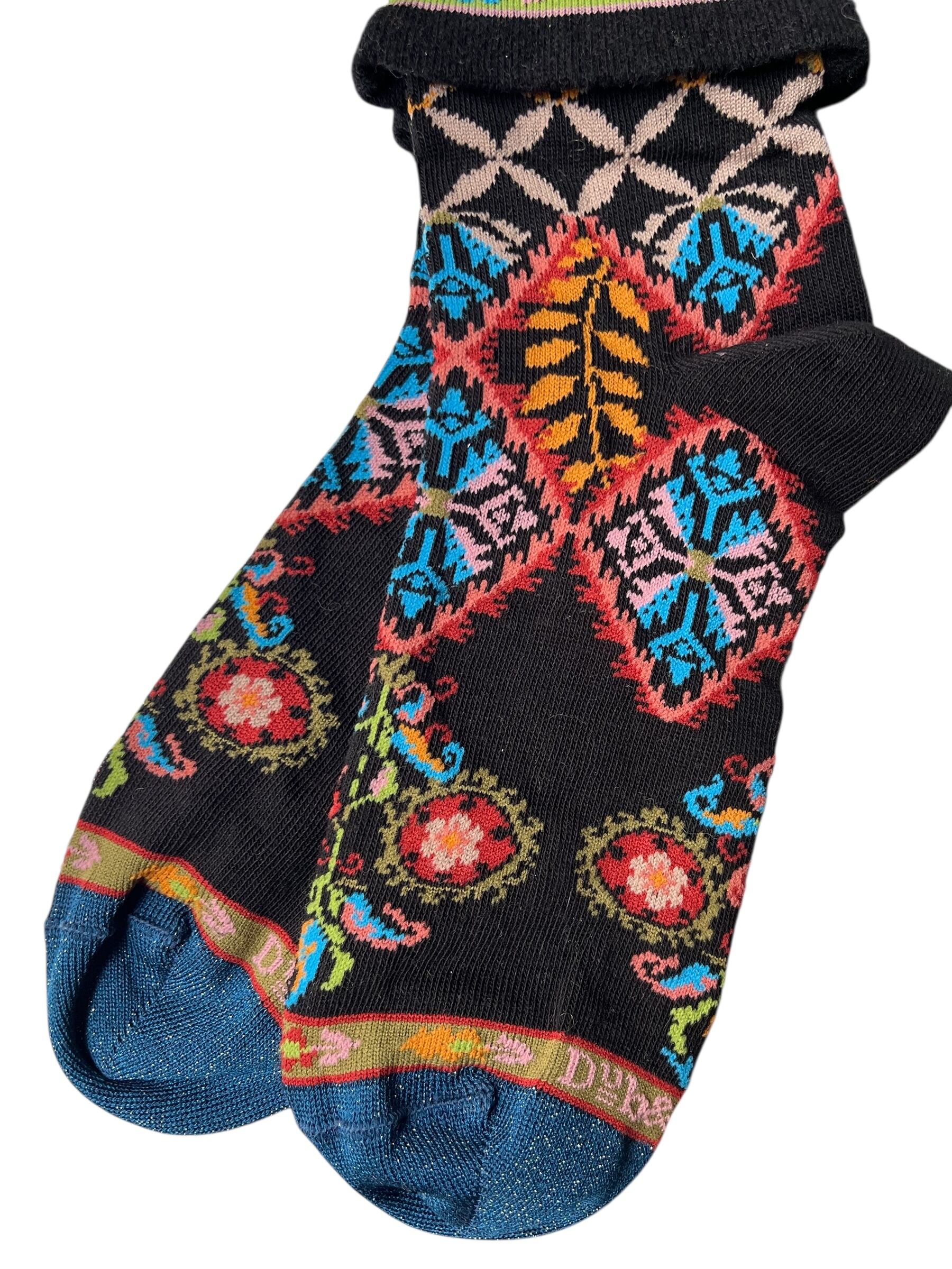 こちらのソックスは折り返しデザインですが、伸ばして履いていただくこともできます。細部にまでラメ(全くチクチクしない)や織柄が入っていて履いているだけで気分の上がるソックスです。