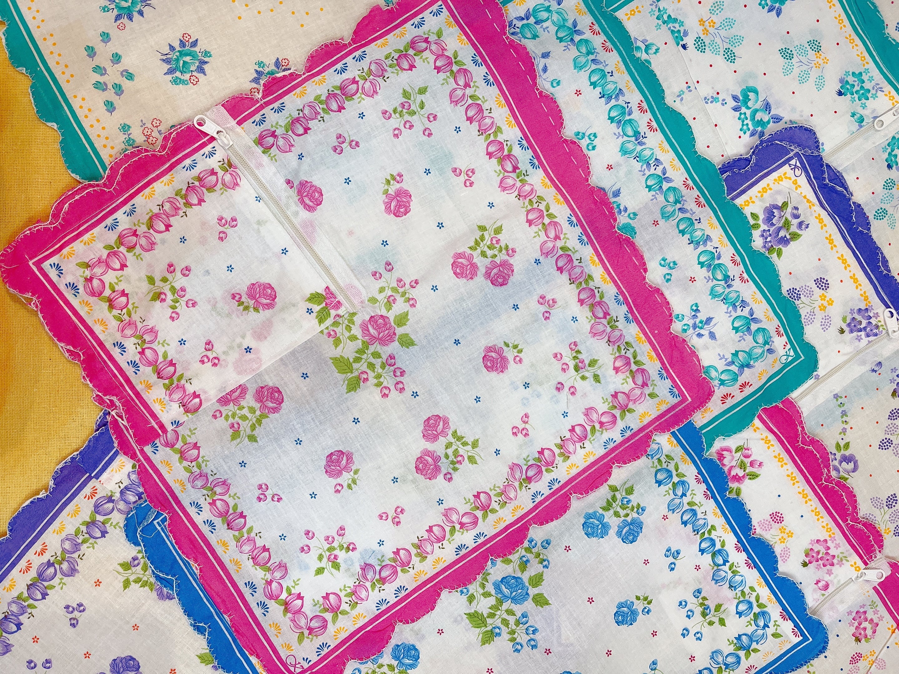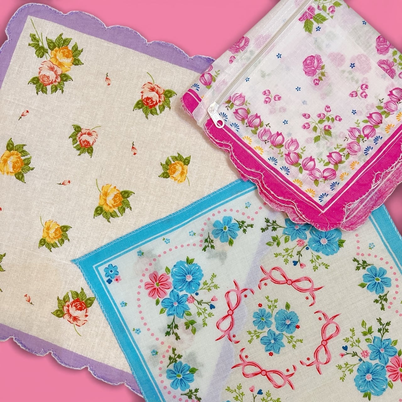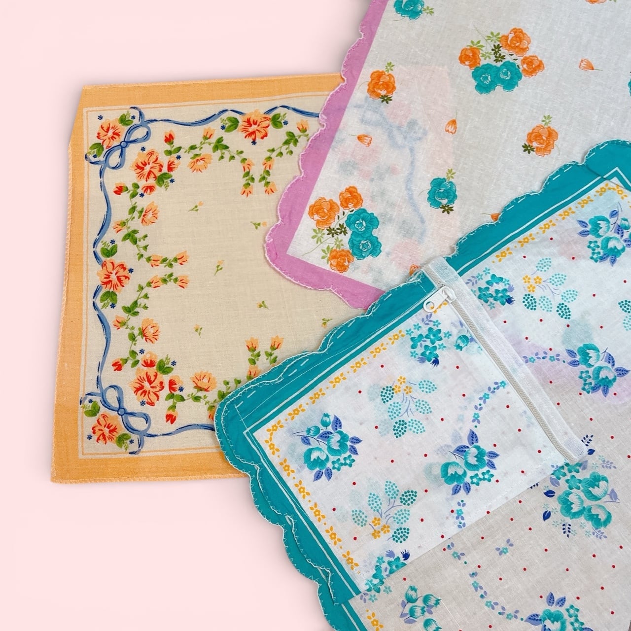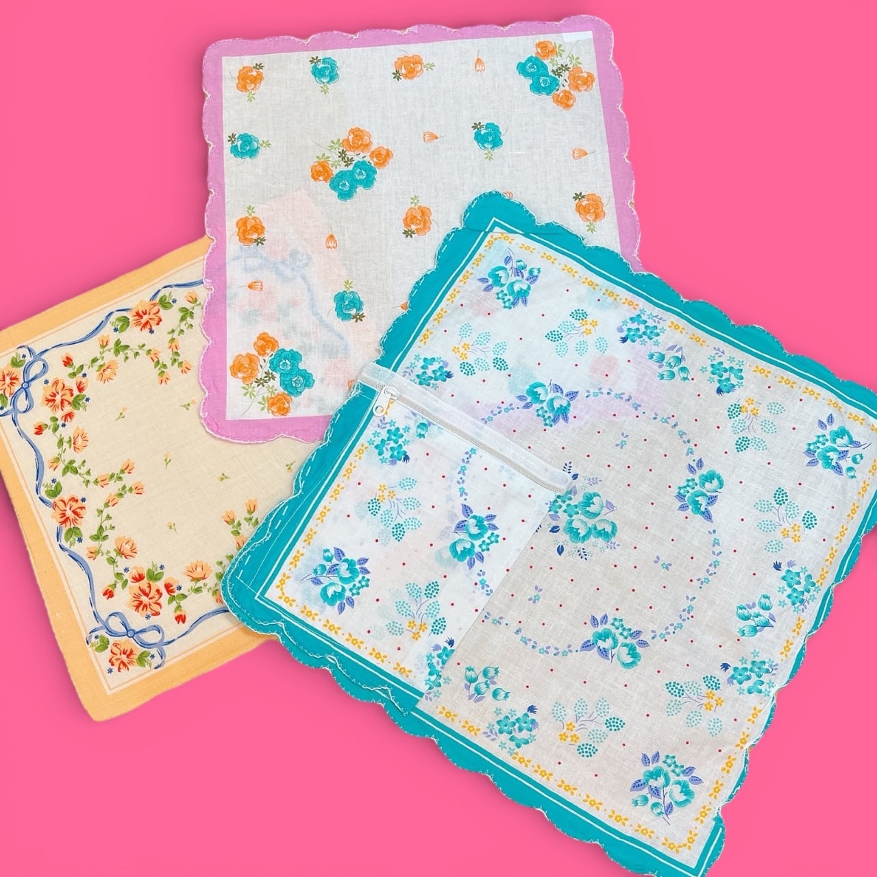 ジップポーチつきのハンカチは必ず一枚お入れします。ナプキン入れるのに画期的!リップやコンパクトも入りますのでとても便利だと思います。