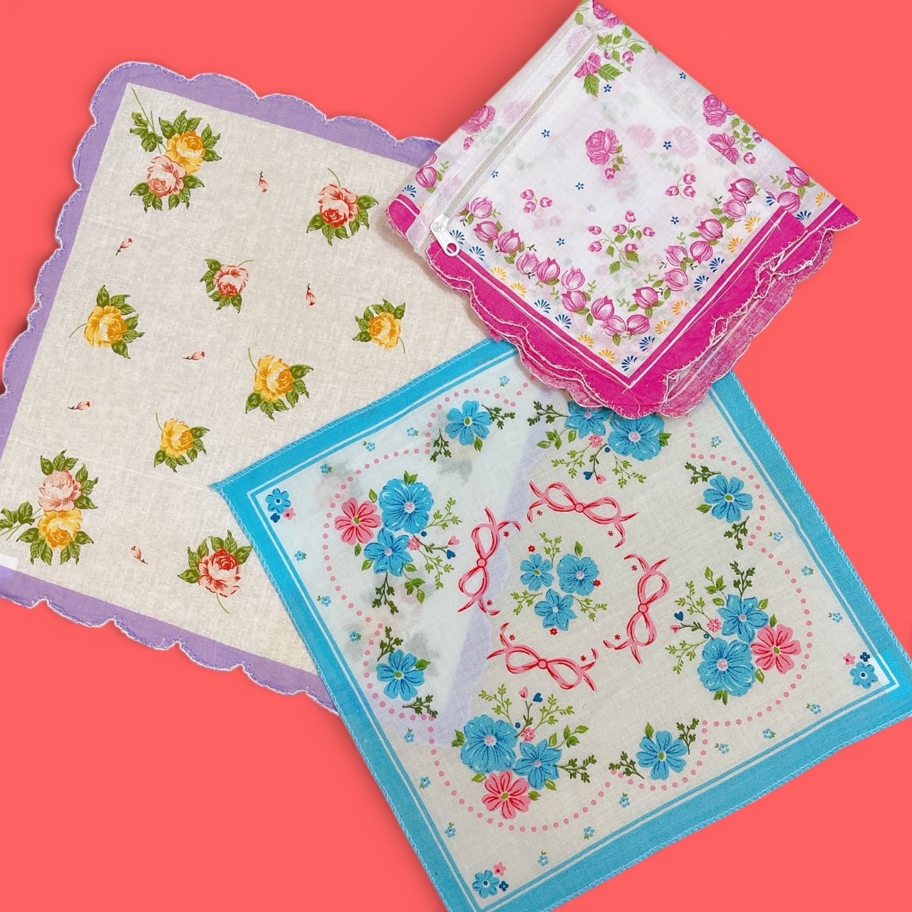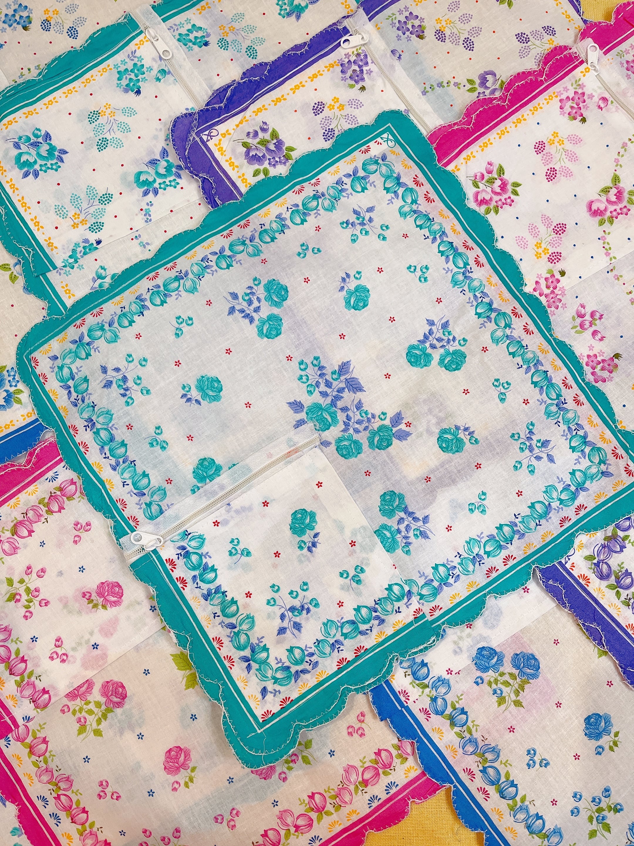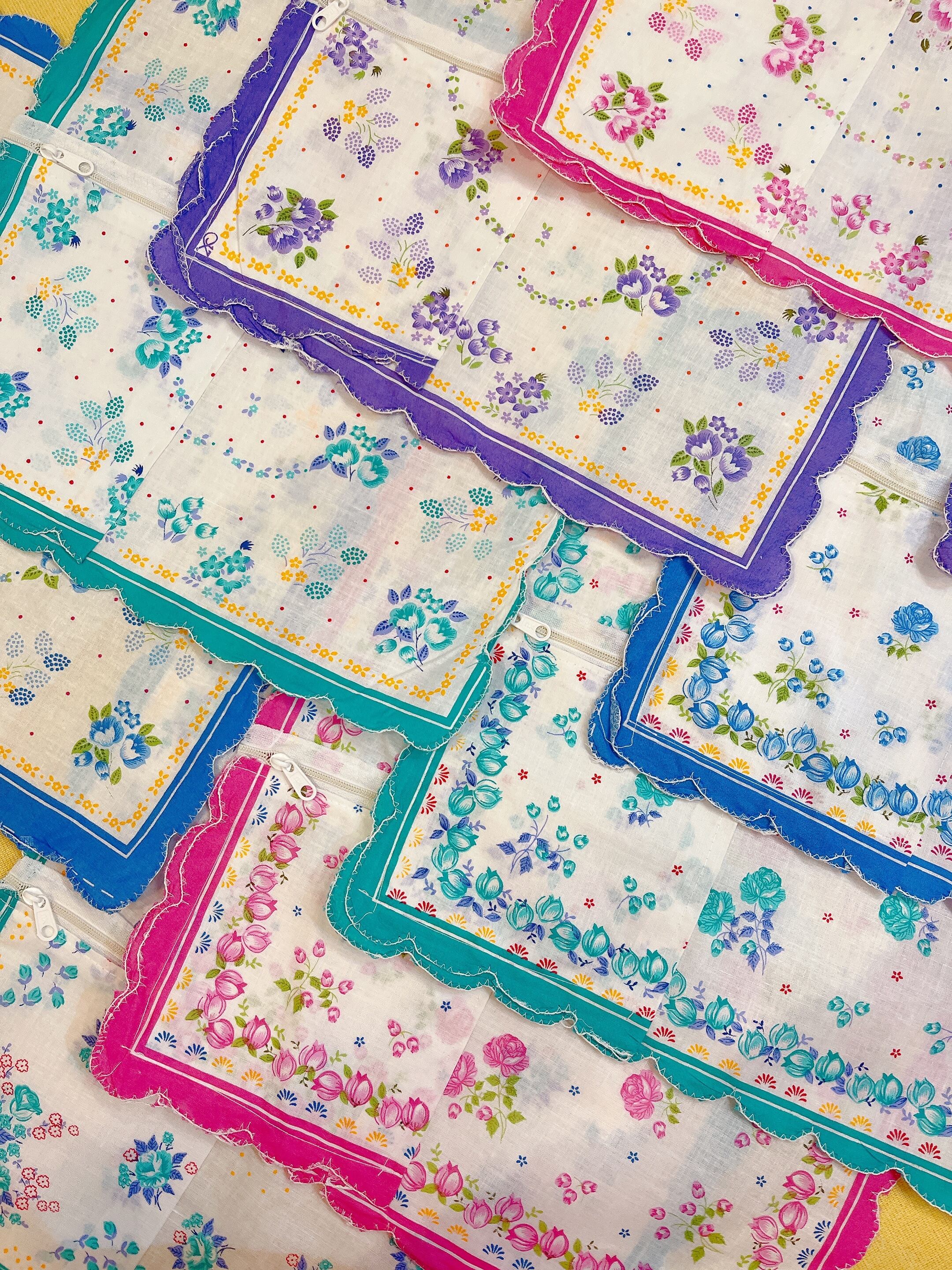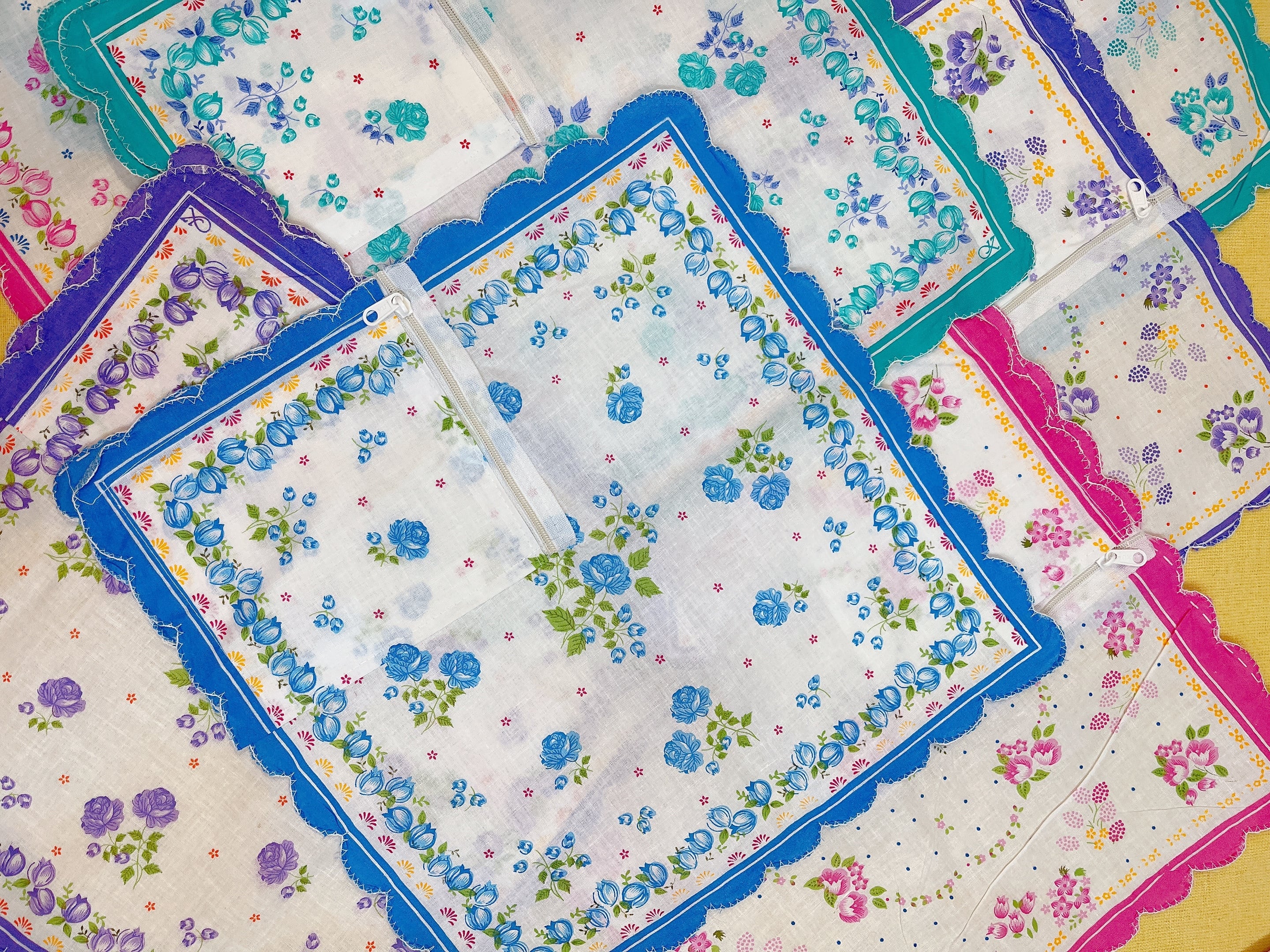 ジップポーチつきのハンカチは必ず一枚お入れします。ナプキン入れるのに画期的!リップやコンパクトも入りますのでとても便利だと思います。