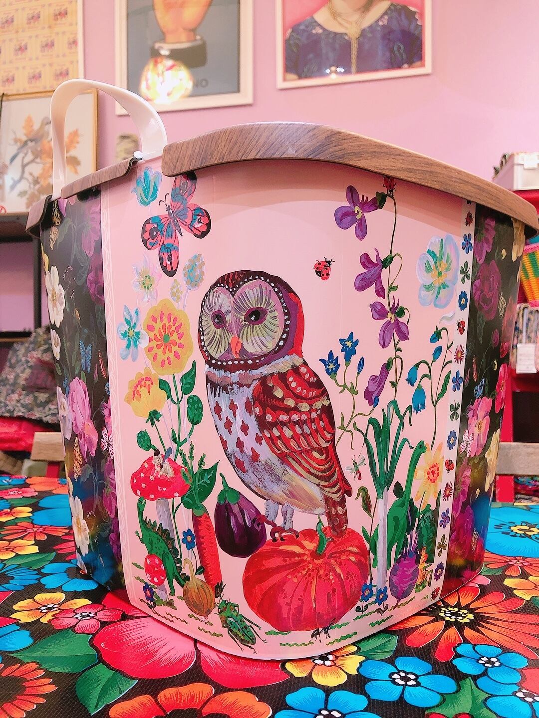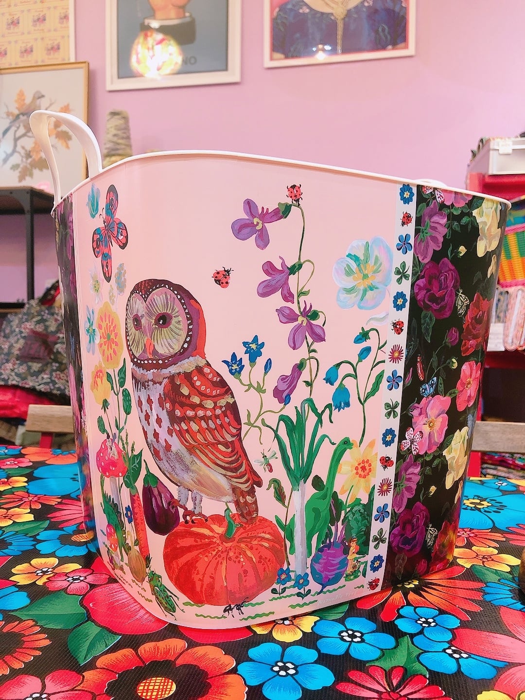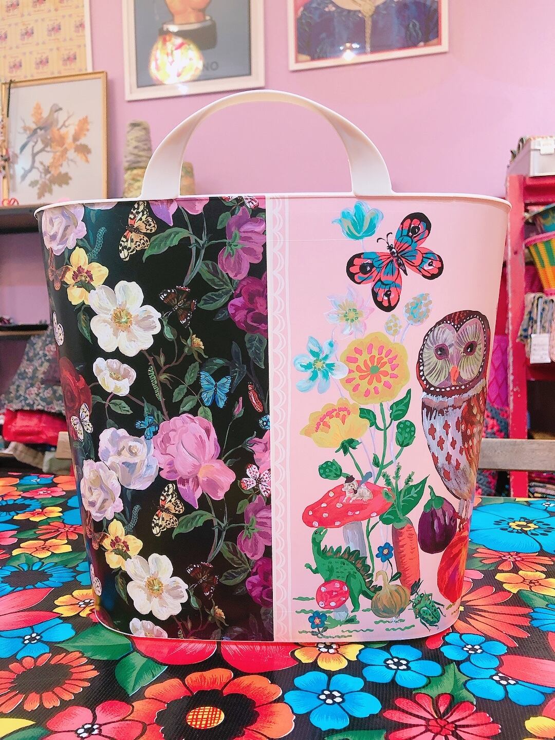 ナタリーから提案されたデザインの中から、幸せを呼ぶフクロウ柄をチョイスして、花の絵柄と合わせたMAZURKAオリジナルバケットです。