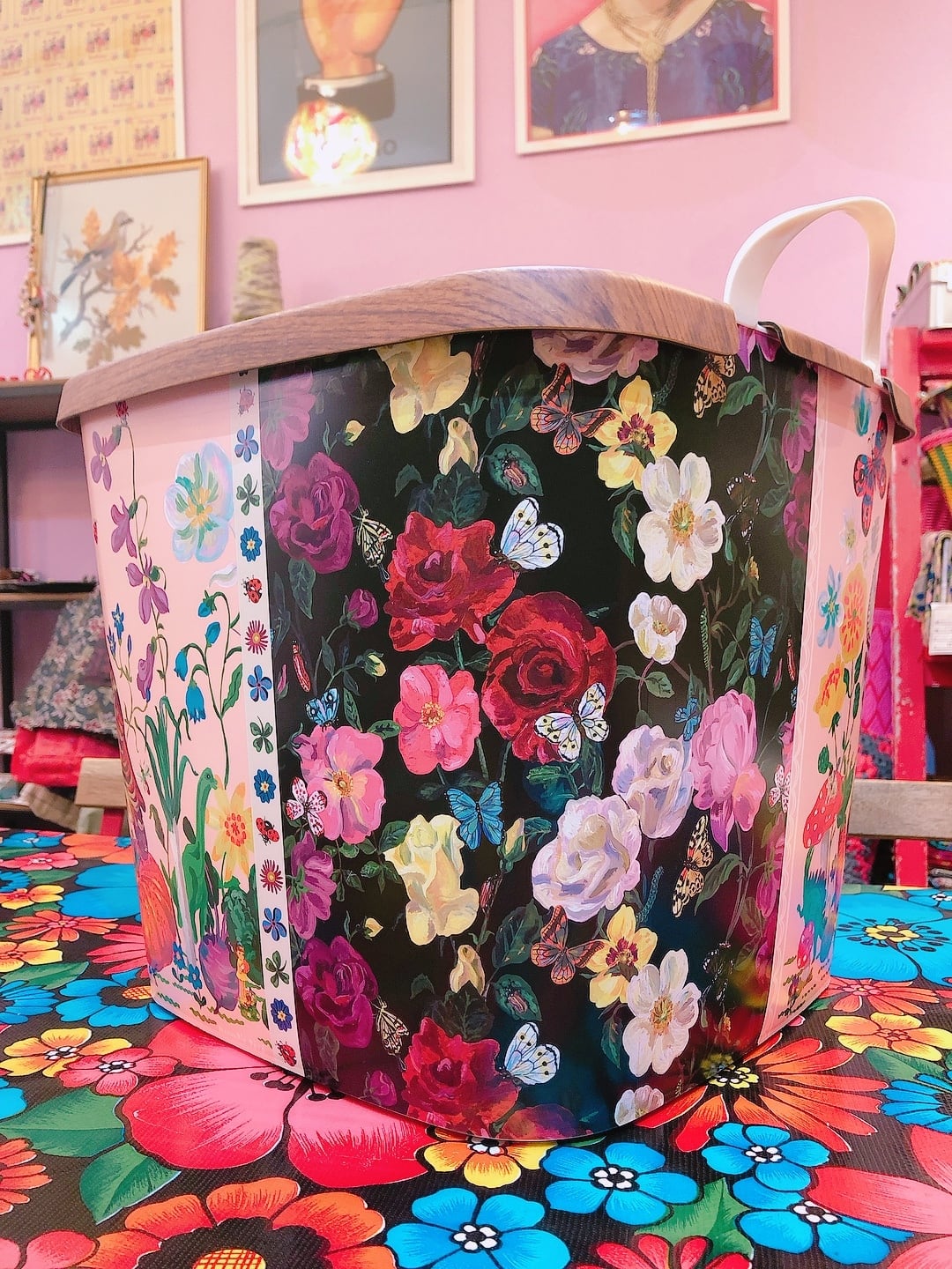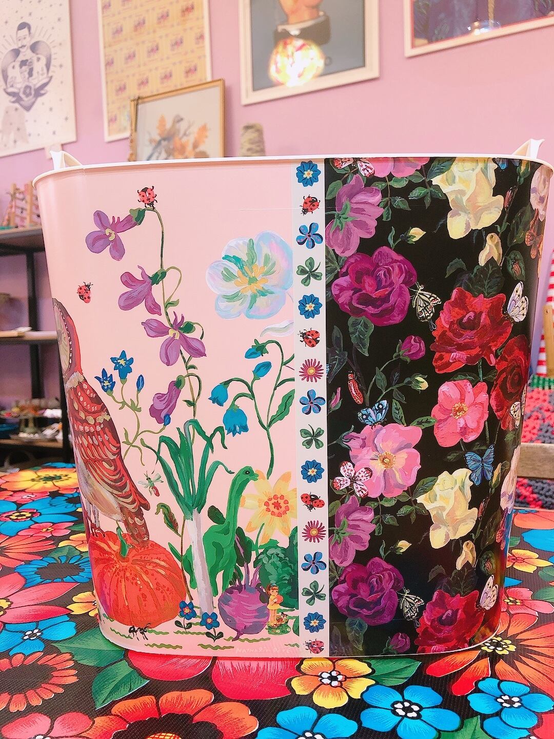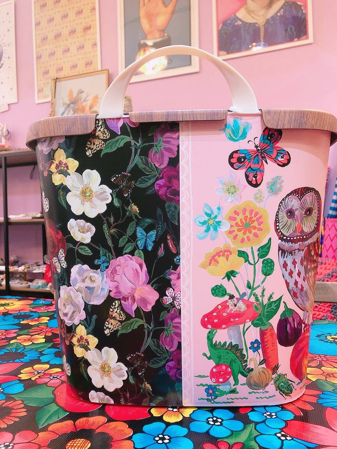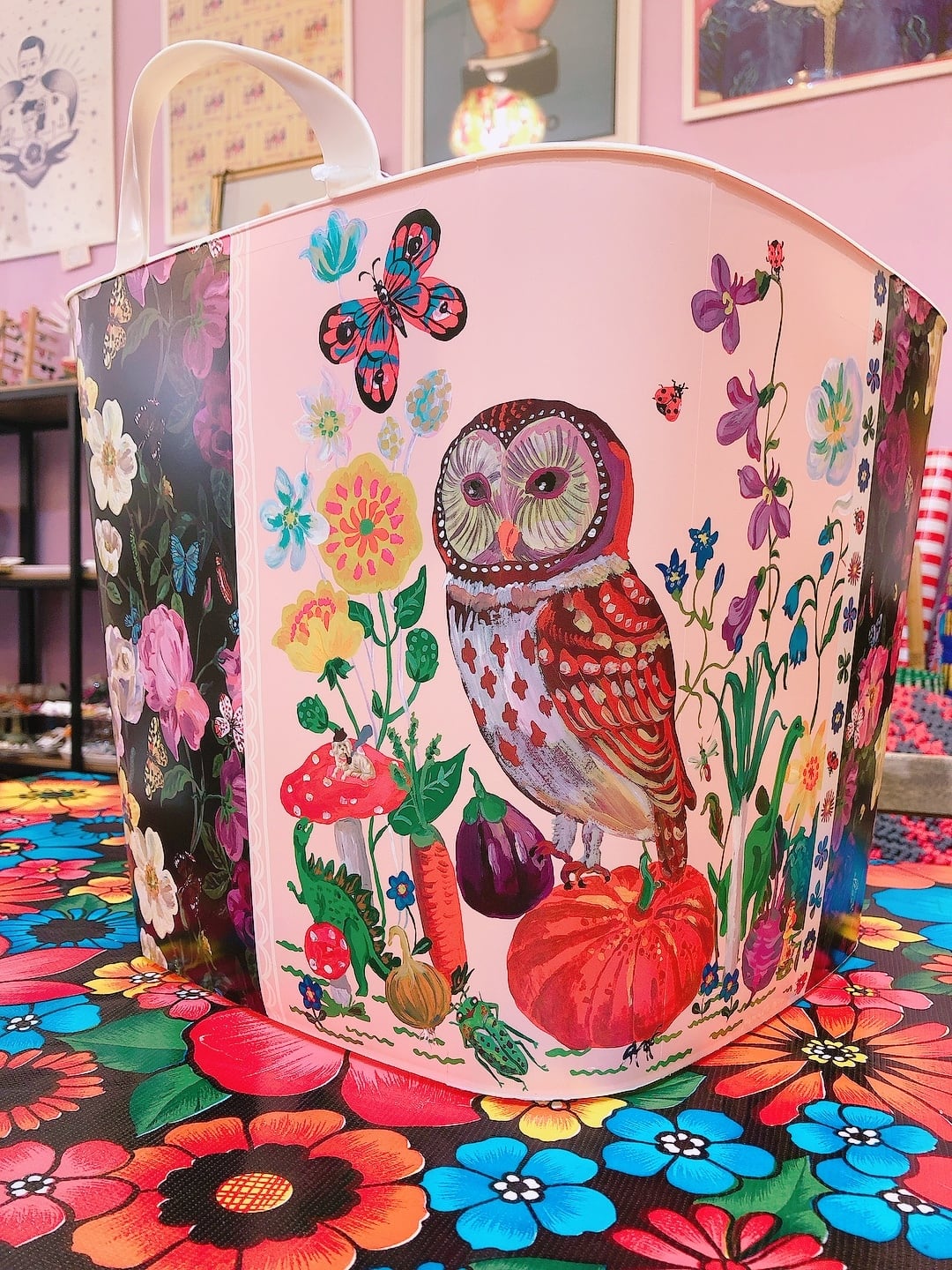 ナタリーから提案されたデザインの中から、幸せを呼ぶフクロウ柄をチョイスして、花の絵柄と合わせたMAZURKAオリジナルバケットです。