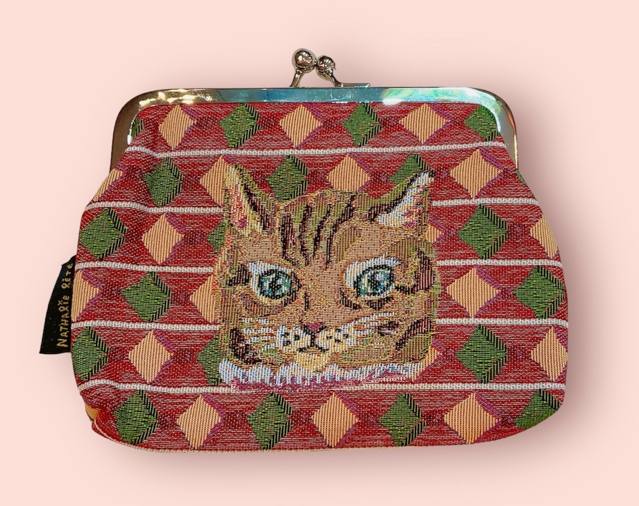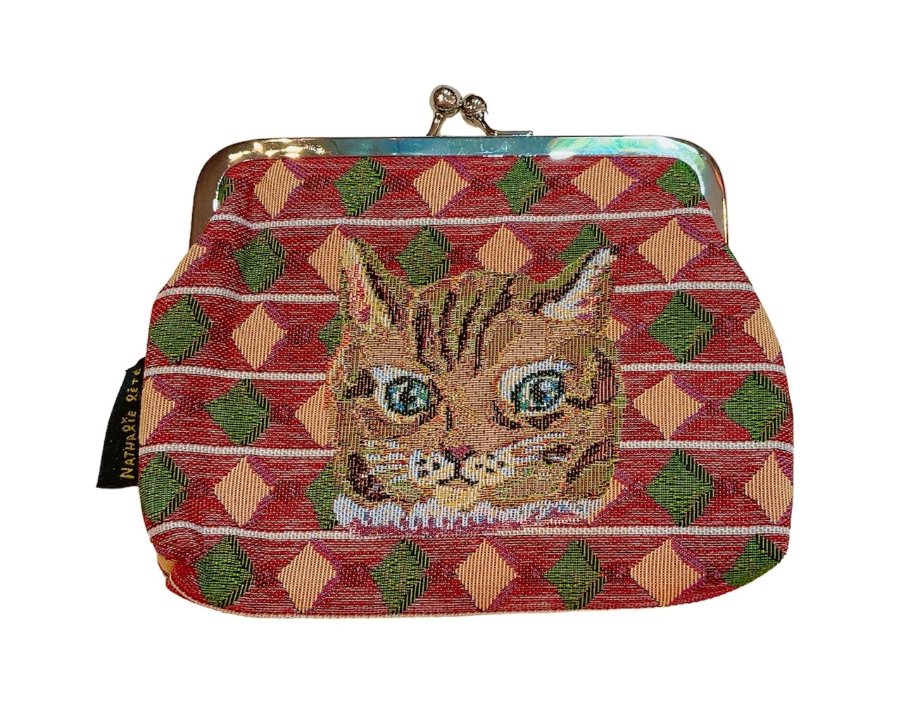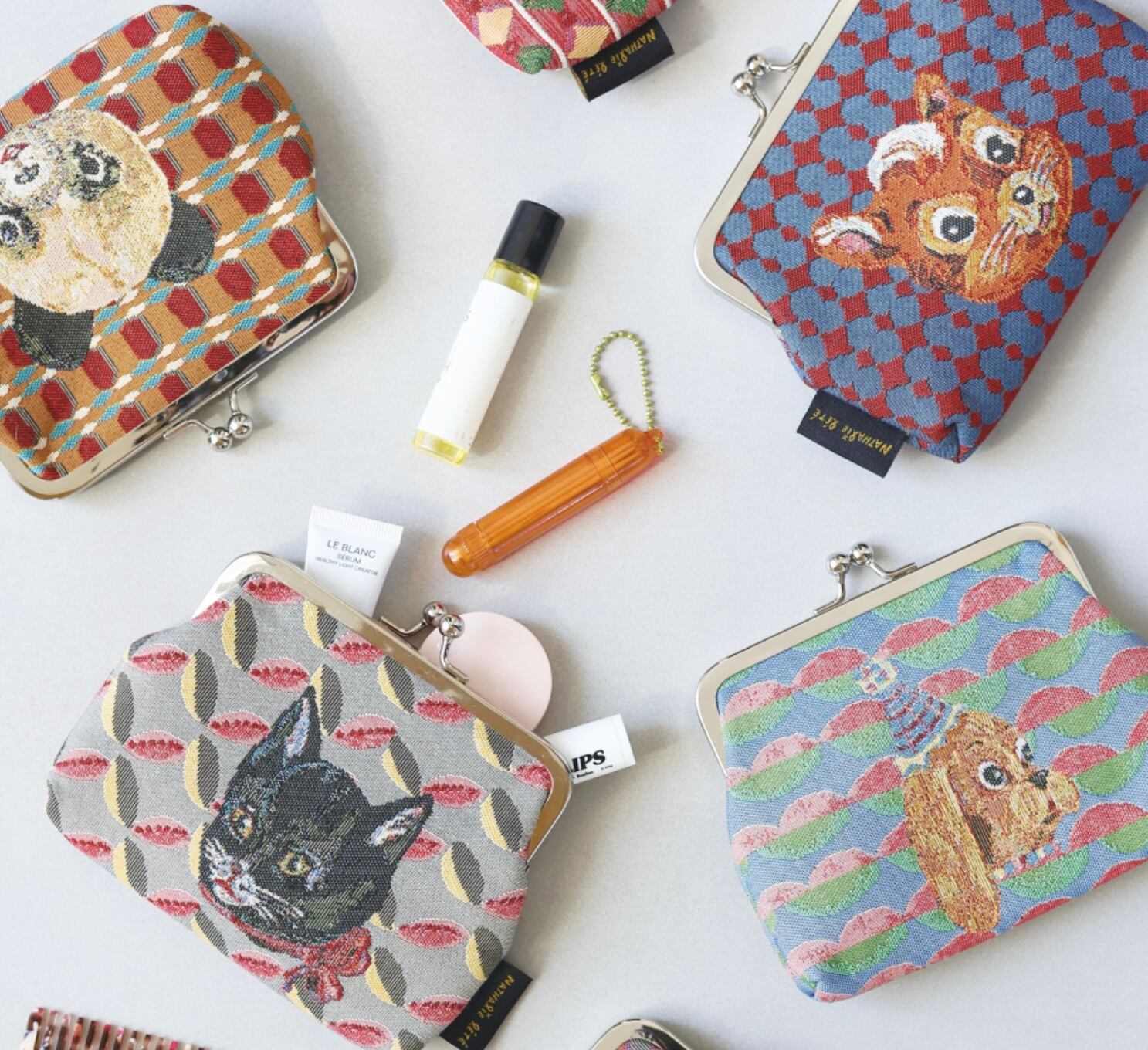 ナタリーレテの描く独特な表情の動物とリボンデザインを織り込んだがま口ポーチです。