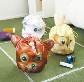 綿入りのサテン生地で仕上げていて、底にはマチが付いているので、立体感のある動物たちの表情を楽しみながらも、容量たっぷりです。